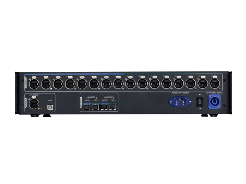 Commissioning is very simple – the signal is received through 4 fiber optic inputs from the controller and distributed to 16 Ethernet outputs leading to the end devices. Of the four optical ports, two are main lines and two serve as backup lines. The 16 RJ45 ports are freely configurable as either main or backup connections. For power supply, you have two connection options for more flexibility and especially more security: one is a cold appliance plug with 10 amps, the other is a blue PowerCon. For control, you can connect the distributor via an additional RJ45 port or USB 2.0 (Type B). On the front, a handy display quickly shows the status of each connection.