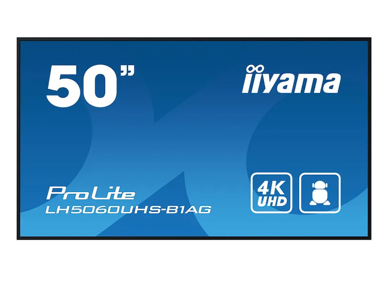 50″ 3840×2160, UHD IPS panel, Haze 25%, 500cd/m², Landscape and Portrait, Speakers 2x 10W, 3x HDMI, USB 2.0 x2, WiFi, LAN, Media Play USB Port, Control LAN / RS232C, iiSignage2 (CMS/DMS), E-Share, Android 11 OS, file- and web browser, 24/7 Operation, Slim design depth 39mm, VESA Mount 400×300 – wallmount included